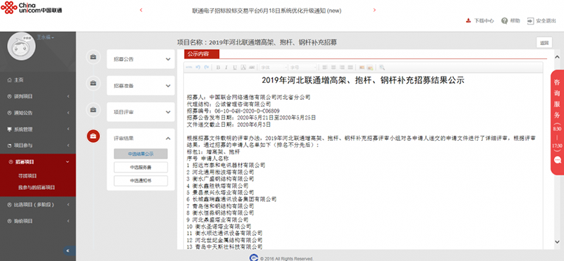 我公司于2020年6月3日 聯(lián)通入圍 ( 2019年河北聯(lián)通增高架、抱桿、鋼桿補(bǔ)充招募公告)