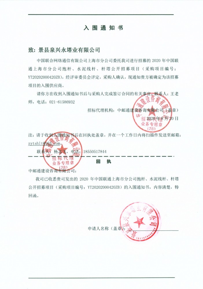 我公司于2020年8月20日收到上海聯(lián)通入圍通知書(shū)